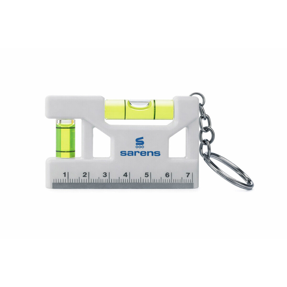 Practical and multifunctional! This keychain made from recycled ABS features a spirit level, measurement scale, and a magnetic strip on the underside for easy attachment to metal surfaces. Perfect for everyday use and small tasks.